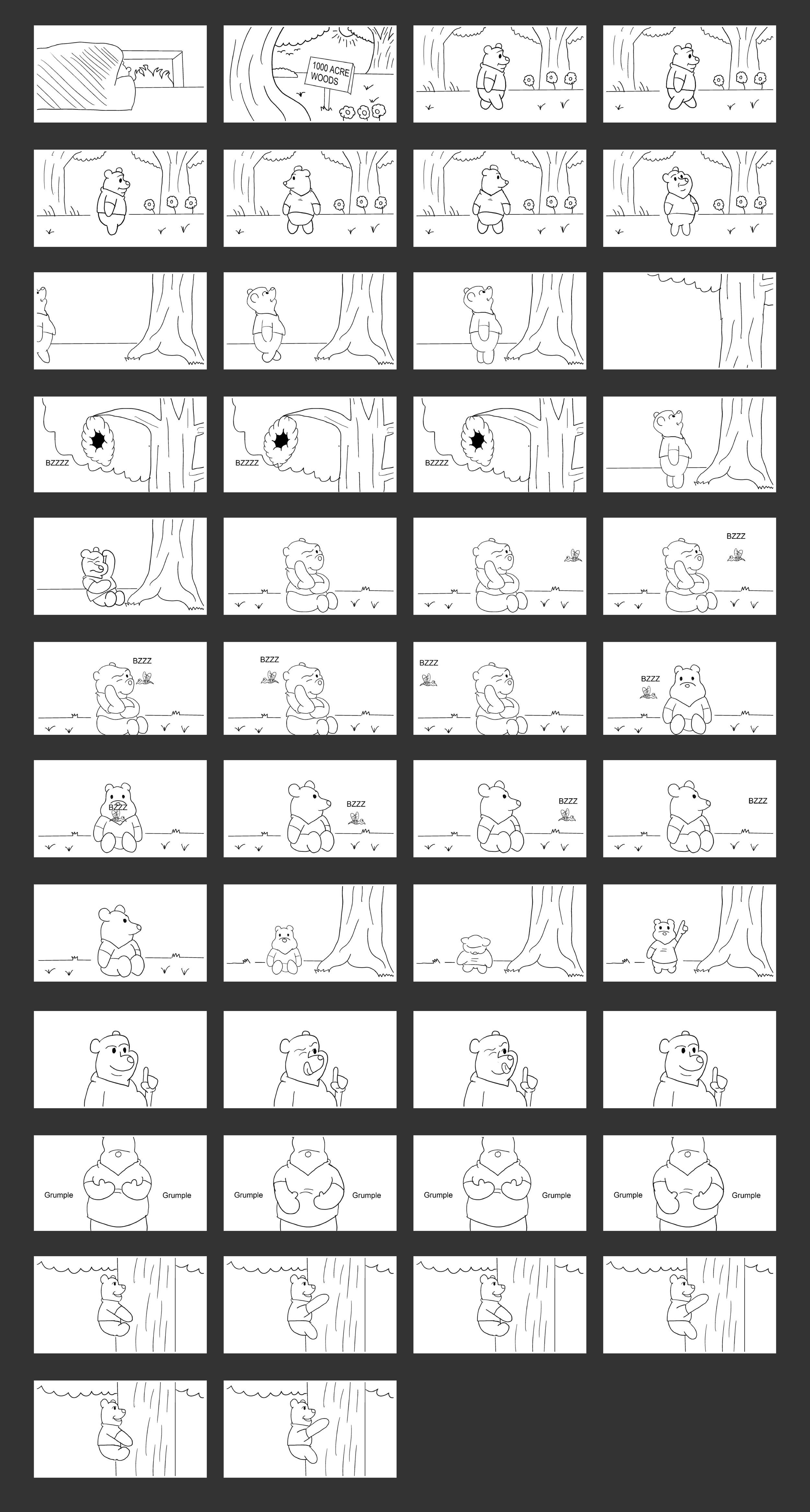 Remember, these are storyboards, not thumbnails. My drawings should still be gestural (not polished beautiful drawings) but convey all the important information: character designs, composition, backgrounds, lighting (when relevant)...